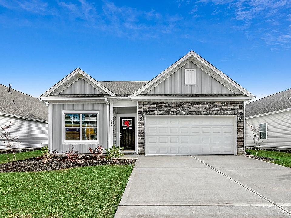 The Hatcher is a two-story floorplan with three bedrooms and three bathrooms. A guest bedroom is located at the front upon entry, along with a separate full bath and linen closet. Oyster Oak luxury vinyl plank flooring extends throughout the main living areas on the first floor. The large great room is open to the kitchen and eat-in area. The kitchen features a corner pantry, upgraded white cabinets, gray tile backsplash and quartz countertops. The backyard is accessible through the eat-in area and offers a screened-in covered porch with an additional fourteen-foot by ten-foot uncovered patio extension, perfect for entertaining! The primary bedroom is also on the first floor, situated off the gathering area and includes a tray ceiling. Ensuite bath has a double vanity with quartz countertops, five-foot tiled shower with glass enclosure and a large walk-in closet. Upstairs is a guest suite with private bath. This home is complete with a laundry room at the garage entry and a car and a half garage. Additional options include decorative molding upon entry and laundry room cabinets for storage. Cypress Village has a fabulous amenities center and community pool with fitness room, putting green, fishing ponds and more! Photos are of another finished Hatcher.