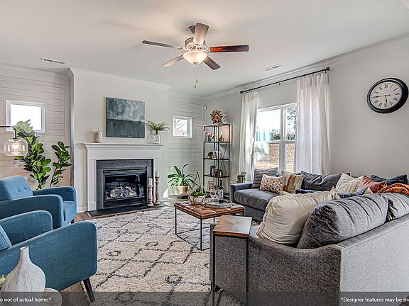 Meet The Russell, a stunning two-story home boasting four generous bedrooms and three full bathrooms on a fantastic lot. A large guest bedroom and full bath welcome you as you enter the home. The front hallway then leads to a wide-open living area that seamlessly integrates a modern kitchen, dining area, and a spacious great room, highlighted by a black-slate gas fireplace. The kitchen is a dream, with white cabinetry, quartz countertops, and stainless steel appliances, including a natural gas stove. Upstairs, the primary suite is a true oasis, featuring a tray ceiling, a gorgeous private bath, and two walk-in closets. The upstairs guest rooms are oversized, and both include walk-in closets. Topping it all off is a huge loft—large enough to serve as a second great room or a game room for quality time with loved ones. Out back, a covered porch overlooks the beautiful yard, which backs up to a tree line—a perfect space for outdoor fun or simply enjoying the sunset.