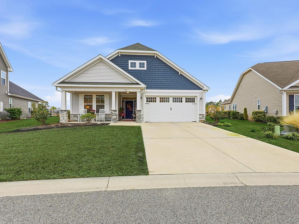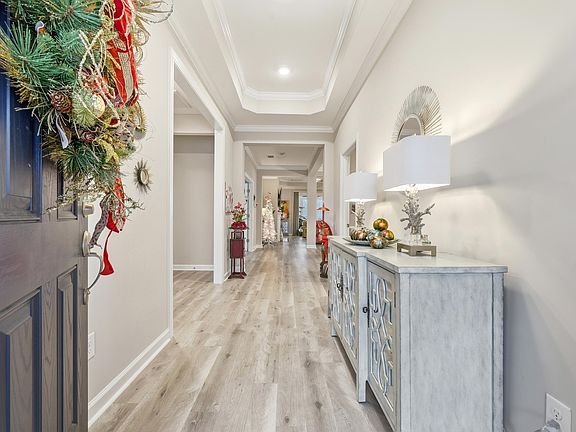 Welcome to this beautifully maintained, model - perfect 3 bedroom, 2 bath home offering exceptional style, comfort and coastal inspired charm. From the inviting front porch to the bright, open interior, every detail has been thoughtfully designed. Step inside to a spacious open floor plan featuring elegant, coffered ceilings, abundant of natural light and designer finishes throughout. The gourmet eat in kitchen boasts granite countertops, tasteful backsplash, stainless steel appliances, large custom island with ample cabinet space- ideal for entertaining or everyday living. The living and dining areas flow seamlessly together, highlighted by beautiful flooring and custom detailing. The serene primary suite offers a generous walk in closet and spa like bath with double vanities, garden tub and large walk in shower. Two additional bedrooms provide flexibility for guests or an office. Step out into your enclosed sunroom to relax or out to your private backyard oasis with a large patio and saltwater gunite pool. This home sits on almost a half acre lot and features tons of upgrades- finished garage, irrigation system and much more! Bridgewater is an amenity rich community with a large clubhouse with a catering style kitchen perfect for private parties and social gatherings. A state of the art fitness center with virtual fitness classes, a resort style pool with lap lanes and lounging space is surrounded by deck chairs and private cabanas.There’s also pickleball courts and a bocce court, a friendly fire pit, a kayak launch and an enormous outdoor cookout area at the covered pavilion with outdoor grills and televisions. Come live the Good Life at Bridgewater! This home won't last long, schedule your showing today!!