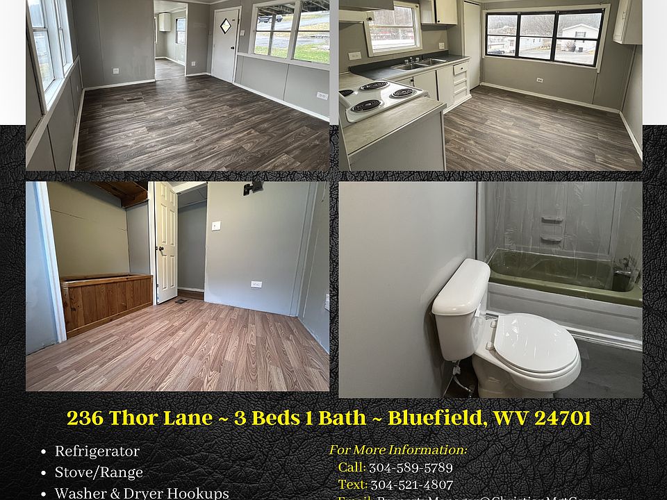 236 Thor Lane ~ 3 Beds 1 Bath ~ Bluefield, WV 24701 LEASE OPTION (Path to Home Ownership): Initial payment: $1,500 with no payments due until the 1st of the following month! Monthly payment: $695/month. Includes lot rent & curbside trash pick up. or RENTAL: Security Deposit: $695. Can be made in payments if needed. Monthly payment: $695/month. Includes lot rent & curbside trash pick up. Sorry, this home is not HUD approved. Three bedroom, one bath older model single wide mobile home for rent. Bay windows in master bedroom and in the kitchen. Pantry in kitchen for extra storage. Washer & dryer hook up. New paint throughout. Large covered front porch for entertaining. New vinyl wood flooring throughout most of the home. Large open kitchen with dining room. Furnished with a stove and refrigerator. Central electric heat. Located in Hideaway MHC in Greenvalley, WV. Two car paved driveway. Flowerbeds around front porch for planting. Ready to be moved into! Christian Management Corporation Office Hours: Mon-Fri 9:00AM-5:00PM & 10:00AM-2:00PM the 1st Saturday of every month You can view THIS property 7 days a week! Most pets welcome with a $300.00 pet fee per pet and signed pet agreement. Maximum 2 pets. No aggressive breeds due to insurance restrictions. Clean, safe, quiet, crime & drug-free are our priorities for our residents! We support Equal-Housing Opportunities! Good people with good, bad, low, or no credit but stable employment or Social Security are welcome. -MUST pass background check -NO evictions in the last 7 years -NO sex offenders Is this property not what you are looking for? View our other available #homes, #mobilehomes, #apartments, and more on our Facebook or our website!