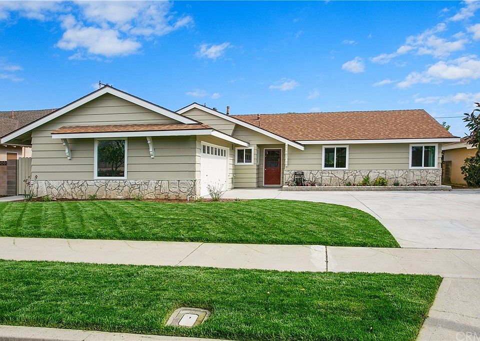 THIS WILL GO FAST! Beautifully remodeled, 4 bedroom, single level, turnkey home is ready to move in. Home features newly installed deluxe Life Proof flooring throughout w/4 inch baseboards. The completely remodeled Kitchen features white cabinets with soft close, gorgeous quartz countertops, matching stainless steel appliances, recessed lighting and double pantries. Right off the kitchen, is a dining area with white vaulted ceiling that leads right out to an outdoor patio perfect for morning coffee. The living room features a fireplace, recessed lighting, and sliding glass doors which lead out to the back yard. All three guest bedrooms have recessed lighting with dimmers and mirrored closet doors. The full guest bath has quartz counter tops and stunning marble shower. The master suite features plenty of natural lighting and a stunning marble walk in shower. The home has been recently painted inside and out, includes new dual pane windows and sliding glass doors throughout the house, newer central air and heating unit and many more features. This home has Great Curb appeal with manicured yards, newly installed automatic Rainbird sprinkler system & drip system is set up on 4 time zones to water lush green lawn and drought proof plants. Home has an extra large clean driveway with potential for front RV/Boat parking .All appliances included. It's located in highly desired neighborhood centrally located in Orange with easy access to all the major freeways.