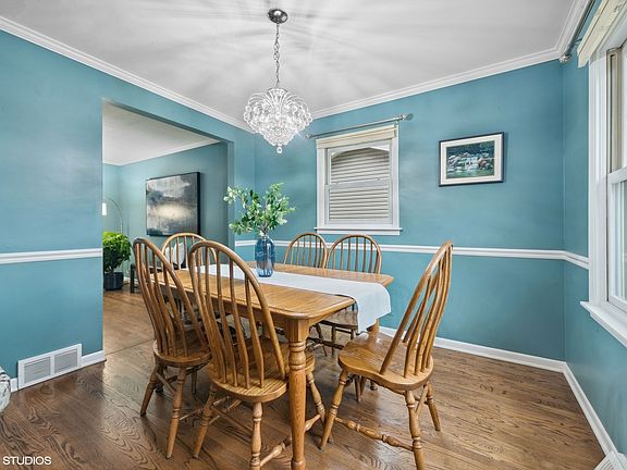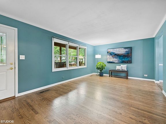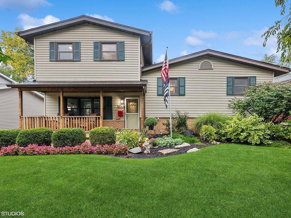 Hallelujah! Finally, an updated beauty within walking distance to Metra, Hawthorn Park, Paddock Elementary School, and vibrant downtown Palatine. This 4 BR, 3 BA home offers four levels of quality living. New roof in September 2023. The beautiful owners' suite addition features 300 SF bedroom with sitting area and private bath with dual vanity, oversized glass enclosed shower, linen tower, and tremendous closets. Hardwood floors throughout main level and in three bedrooms. White cabinets, glass subway tile backsplash, granite counters, newer stainless appliances, glass front cabinets, crown molding and ceiling fan in common sense kitchen. Immense living room with triple windows and crown molding. Crystal drop chandelier, crown and chair rail moldings, and serving counter from kitchen in spacious dining room. Gorgeous updated baths! Second floor hall bath boasts glass vanity with brushed nickel column faucet, and ebony mission style cabinets, framed mirror, built-in linen shelves, and white subway tile floor. Three generous bedrooms with ceiling fans, good closets and hardwood floors complete the second level. Massive family room with new LVP flooring (2023), corner woodburning stove, plenty of windows and recessed lights is ideal for nights at home or entertaining. White quartz top vanity with polished nickel faucet and curved cabinetry, white quartz tile shower/tub surround with mosaic border and toiletry niche, and new LVP flooring in lower level bath. Well-lit laundry center with utility sink, freezer, door to yard, and white washer and dryer share space with HVAC equipment. Wait! There's more outside! Concrete driveway, 26' x 24' garage with new roof and siding, lovely patio, mature landscaping and gardens PLUS a 10' x 8' storage shed. Live worry free with the new cleanout pipe and check valve. Enjoy the handy bike/ walking path. Picture yourself on this covered front porch on a quiet evening...you won't want to leave!