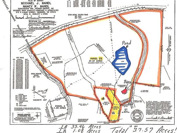 Two Breathtaking wooded parcels with pines, crepe myrtles, oaks, and many different species of trees native to NC. 2 Parcels: 1-A A14-101 35.46 fenced ac. and a paved private driveway that includes riding trails and an aerated pond stocked with Bass. Includes 36'x70' Beautiful Red Barn w/apartment. Concrete Slab & Cinder Block Walls & 8 Stalls. Solar Panels & New HVAC installed in 2021. Two-story barn apartment completely updated in 2016 includes two bedrooms, each with en-suite bathrooms, Open Floor plan on main includes Full kitchen; granite countertops, SS appliances, LVP flooring throughout. Parcel 2, 1-B, A14-142,1.08 Ac, with just about 100' of water frontage & boathouse. 4 Bedroom non-expiring perc test included in documents. . Sportsman paradise with the ability to fish at your leisure or soak up the serenity of the pond on the fishing dock. Leave the city behind while you star gaze by the huge fire pit.