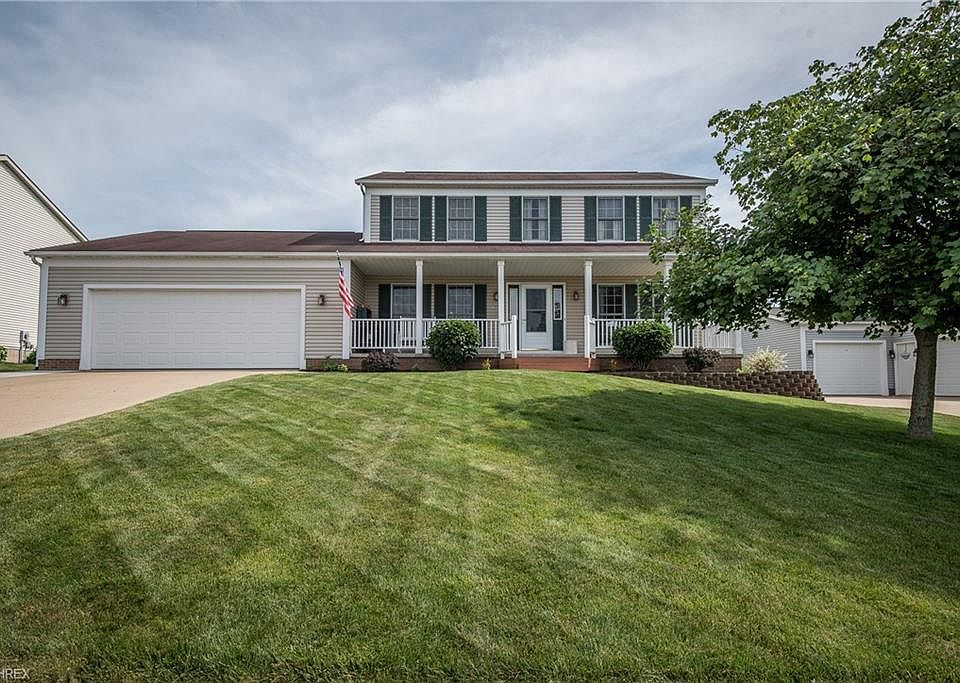 LIKE NEW COLONIAL IN HOOVER ESTATES! This beautifully maintained one owner home catches your eye from the street with its welcoming porch and manicured landscaping. Once inside, you'll love the easy flow of the desirable center hall floor plan with formal dining room and living room with newer carpet and woodburning fireplace with gas starter at the front of the home. The eat-in kitchen offers a dinette with a wonderful view of the paver patio plus additional seating at the counter. The 1st-floor laundry and guest bath are conveniently located in the hall leading to the attached 2 car garage. Upstairs you'll find a master suite complemented by a walk-in closet and private bath with soaker tub and separate shower. Two more generously sized bedrooms include ceiling fans and double closets and share the main bath. The finished lower level adds even more living space with a rec room, bonus room that's currently used as a bedroom and another full bath with corner shower. The walk-up access to the garage provides a private entrance as well as an easy way to move stored items in and out of the home. Added amenities include an extended driveway for extra parking, paver patio surrounded by lush landscaping for privacy and fantastic backyard! Recent updates include a newer water heater and carpet in the living room plus the seller is offering a 1 year home warranty for added peace of mind. Be sure to see this gem in Lake Local Schools!