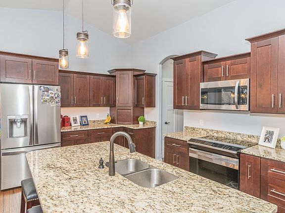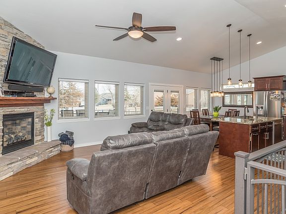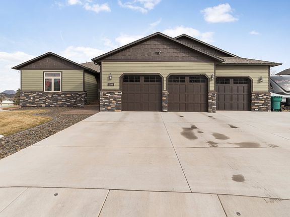 Built in 2016 this like new 6 bedroom (one non-conforming) 3 bath homes offers many high end features. A wide stamped concrete sidewalk welcomes you to an open concept with wood floors, a stone floor to ceiling fireplace, beautiful kitchen with granite counters, over-sized windows with view of Bear Butte, and access to an amazing backyard. Easy accress to a covered trek deck perfect for summer nights. The wide stairs provide access to the landscaped and fenced in backyard and stamped concrete patio. The over-sized 38x26 3 stall heated garage offers a deep 3rd stall. The spacious master features a tile shower with a jet tub. Main bathroom features a beautiful tiled shower. The walk-out basement provides ample light, a wet bar with granite, a floor to ceiling stone fireplace, and access to the covered stamped concrete patio.