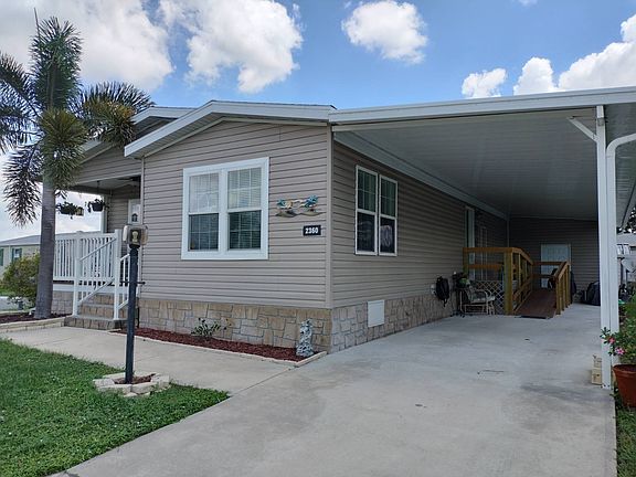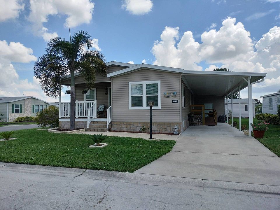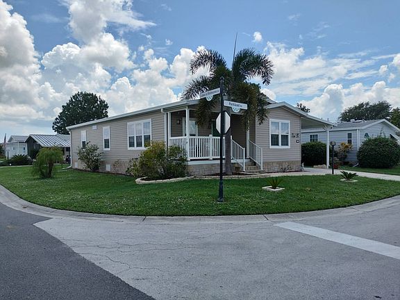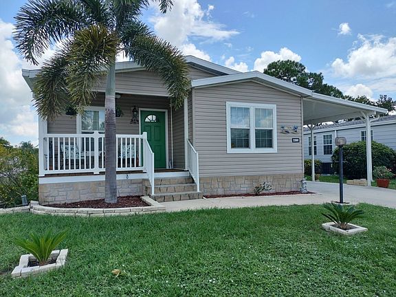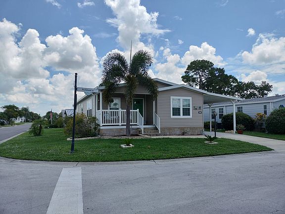 WELCOME HOME! This is a 2 bed 2 bath with a den! 1,312 square feet located in the prestigious community of Lakes of Melbourne 55+. This is a highly desired retirement community just outside of Palm Bay close to most shopping needs. Lot rent here is $754 per month and includes trash and cable service. This house is being sold partially furnished. Boasting a spacious open living/dining/kitchen concept. The kitchen is extremely spacious and has a large kitchen island that looks over the dining and living room. All kitchen appliances stay with the home. The washer and dryer are not included with the sale. Some improvements made to the home include upgraded laminate flooring and carpet in the bedrooms, interior paint, a large handicapped ramp, extra storage shelves in shed and a garbage disposal. Must be park approved to purchase home. The community will run a background and a credit check to be qualified. Park application fee is non-refundable.