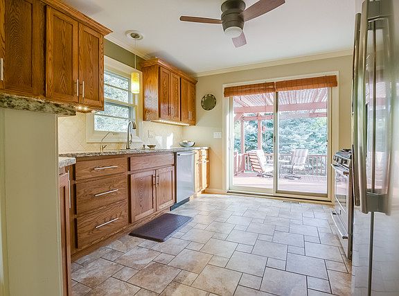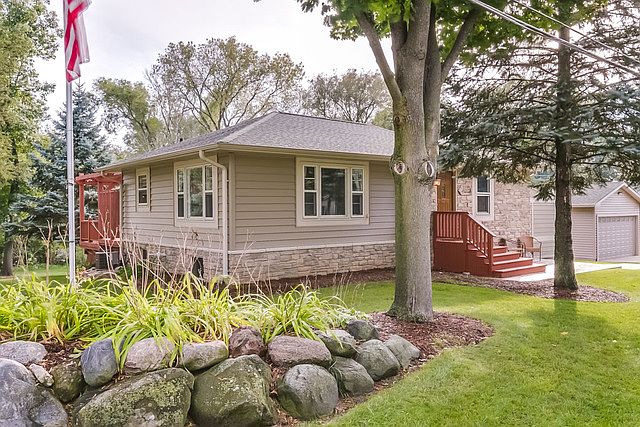 Fully remodeled custom home on double lot with view of Paddock Lake. Custom kitchen has solid oak cabinets, granite counters, breakfast bar, pantry, stainless apps. Custom bathroom has dual showerheads, soaking tub, 1/4 sawn oak cabinets. Sliding glass door to large deck off kitchen. Unfinished basement with 2nd bath leads to indoor workshop with OH door to exterior. New detached 2.5 car garage with extra storage and workbench. Large shed in backyard with OH door.