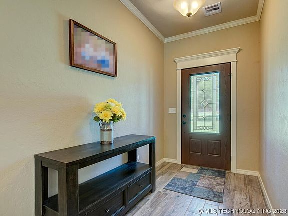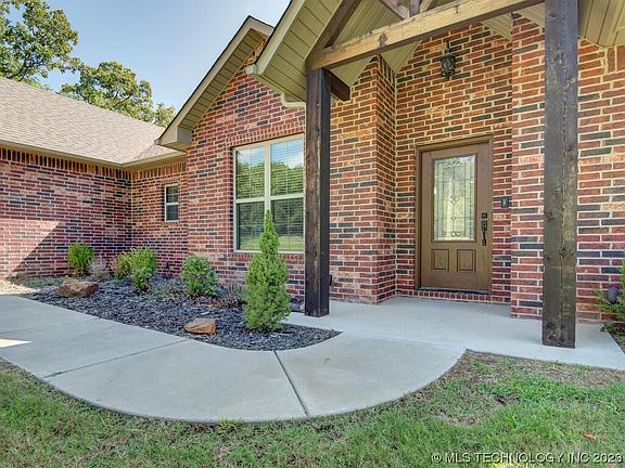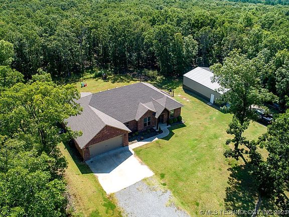 This home was built in 2017, 3 bedrooms, 2 full bathrooms. Flex room is currently being used as a playroom, has a closet and could easily be used as an office or formal dining room. Great privacy, Fully fenced backyard with black chain link. Shop measures 30x40 and does have electricity, garage overhead door, side entry door and separate driveway, part concrete and part gravel. Home is full brick, and all countertops are granite. Pantry has fantastic space and is very functional. Baby monitors do not stay with the home, and the shop is exempt from repairs. Home sits on 6 acres of land, part heavily wooded, great for privacy and/or hunting. Fort Gibson Junior high and High school, straight down 5 Mile Road. Dog run reserved as well.