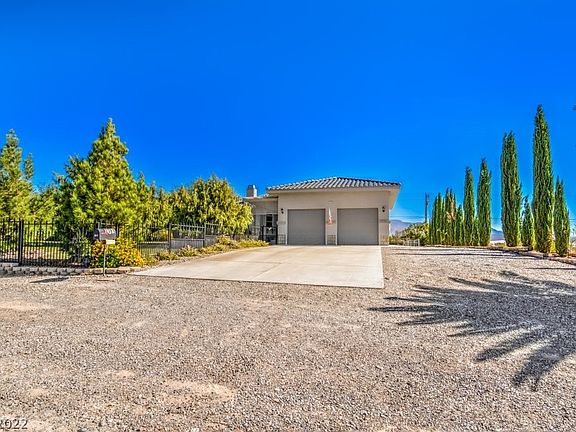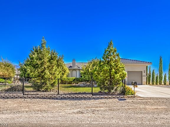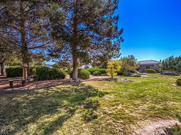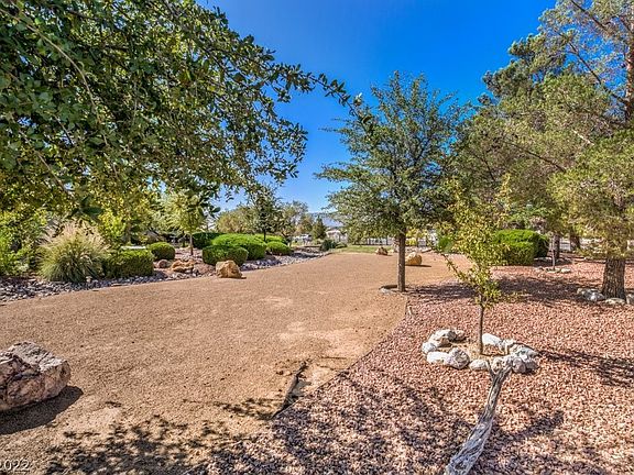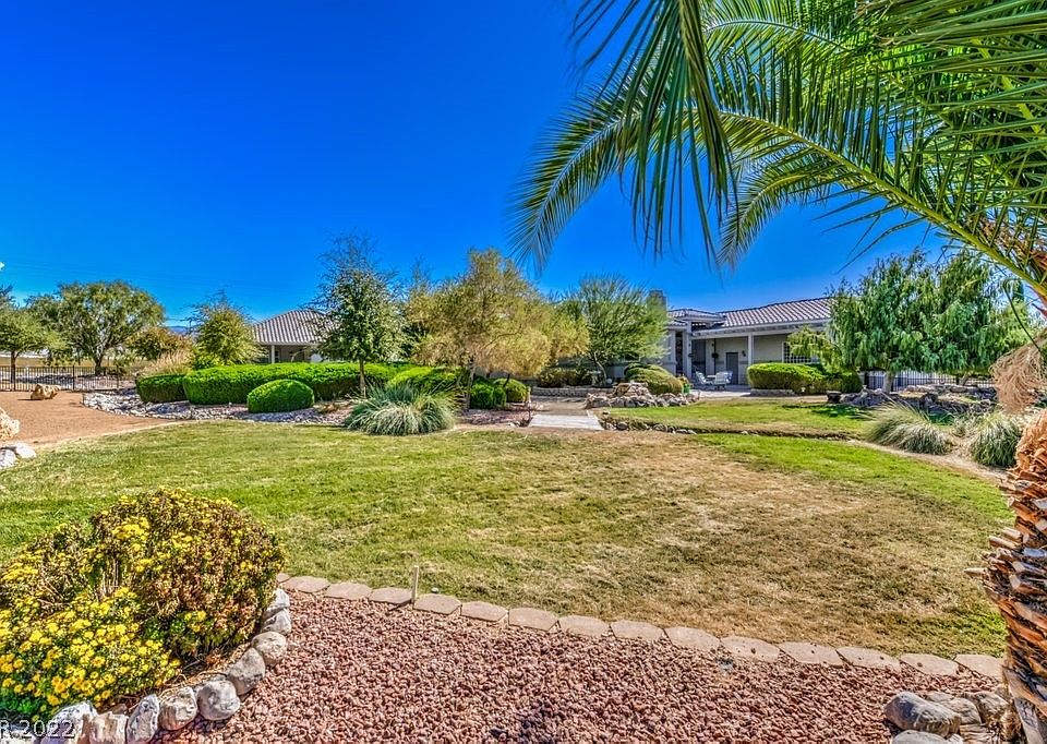 Amazing opportunity on nearly a 2-acre home site. Expansive property includes a main house, full guest house, park like grounds, fountain, fruit trees, vibrant plantings, above ground spa, RV parking with 2 sets of hook-ups, and even the 2 adjoining vacant lots included. Main house offers open-concept living creating the ideal space for relaxing or entertaining. Upgrades include hardwood, custom paint, crown molding, ceiling fans, and wood shutters. You will fall in love with the 60+ foot covered patio with views of the majestic Spring Mountain Range and back of Mt. Charleston. Sunrise and moonrise are magical from this vantage point. Fully furnished guest house is ideal as an income producing property, casita, next-gen suite, studio, home office, home gym, or just extra space. It consists of a spacious living area, complete kitchen, bedroom, bathroom, laundry room, and a relaxing covered patio with custom iron railing. Owned solar panels and numerous storage options make life easier!