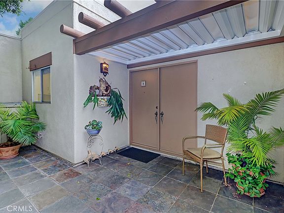 New Valencia CONDO cottage tucked in a private corner surrounded by beautiful trees. This popular floor plan features large front patio and sunny atrium - great spaces to enjoy the indoor/outdoor CA lifestyle. The front entry patio has slate tile flooring and large storage closet. Double door entry with tiled entry and spacious living room leading to the adjacent dining area with its own ceiling fan. The bright living room has west facing windows for nice light in the afternoon! Kitchen enjoys window looking out to the front patio and floor is tiled. Interior atrium lets light and air flow into the middle of the home, gives a cool mid century vibe and floor has painted motif. Back inside, both bedrooms feature good closet space and the primary bedroom is brightened with mirrored closet doors. The large bathroom contains dual sinks, tub/shower combo + walk in shower. Stack washer/dryer located in hallway closet. Located close to Clubhouse 4 - the creative center of Laguna Woods with art and pottery studios, jewelry making, lapidary and sewing rooms plus a wood shop! Take a free class through Saddleback College Emeritus Institute to learn something new. This clubhouse also features pool and spa. Laguna Woods Village residents are privileged to enjoy a 27-hole championship golf course, a 9-hole executive par 3 course, pickleball and tennis courts, lawn bowling, gyms, clubhouses, swimming pools, horse stables, gardening centers, an art studio, computer workrooms and classes + over 200 clubs and organizations! Check out the 3-D Virtual tour - click on the white circles to walk through, 360 icon to walk outside and walking person icon to come back inside. Enjoy!