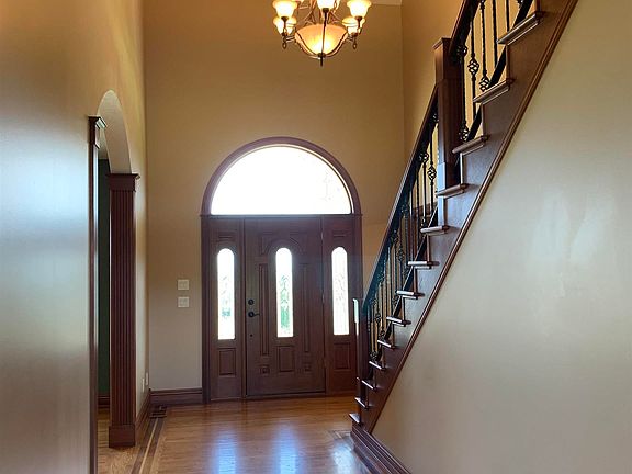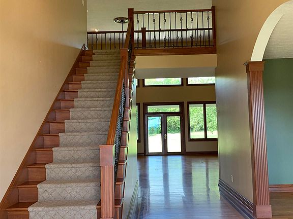 Country Estate with a fantastic view! First time offered, this beautiful custom home, quality built, overlooks an amazing country side view on 22.48 acres m/l, perfectly located on West Road. Home features a grand foyer, 18' ceiling in living room with picturesque clerestory windows, lovely wood flooring, spacious chef's kitchen with pantry and bar, breakfast room and formal dining area. Primary bedroom suite features a tray ceiling and sitting area. Primary bath and closet space will not disappoint, there is 4,997 sq ft of living space and a 3 car garage. Heat pump is Geothermal and there are 2 wells on the property. Feel the breeze sitting on your 20x30 covered pavilion overlooking the in-ground pool with electric cover and incredible view. The acreage has a perimeter fence and is mostly pasture, 2 ponds one very large, 2 barns one completely set up for horses with additional room for all equipment.