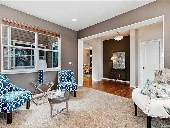 Remarkable home situated on a corner lot in the sought after Canterberry neighborhood. The interior of the home embraces you with an open floor plan and an abundance of natural light. Hardwood floors extend throughout the main entry, dining, and kitchen. 42' cabinetry, center island, & granite counters highlight the gorgeous kitchen. The family room is complete with vaulted ceilings and a gas fireplace. A secluded main level office is ideal for anyone working from home. The upper level features 4 bedrooms & laundry. The master suite has a gorgeous 5 piece bath with double vanities, coffered ceiling, & large walk in closet. Three secondary bedrooms upstairs as well include one with an en suite full bath. The finished basement is complete with a 5th bedroom, full bath and additional living space. The back patio is the perfect space for outdoor entertaining while there is also a private deck off of the dining room. Located just around the corner from Spirit Ridge open space and trails & close proximity to all nearby schools. This home is well maintained and truly shines.