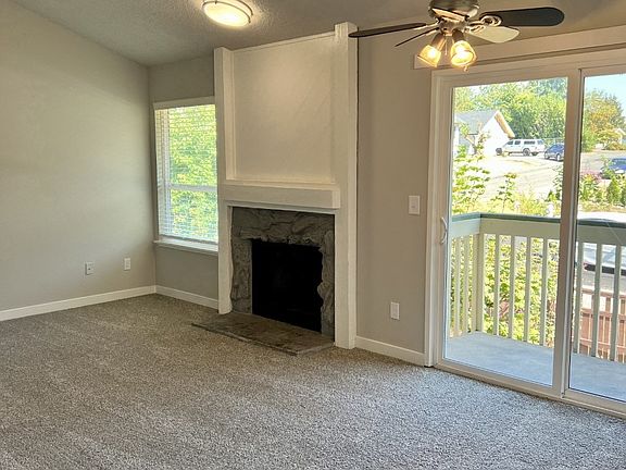 Striking TOP FLOOR 2 bedroom 2 bath remodeled condo in East Hill of Kent located at the centrally located Valley High Condominiums. New quartz countertops in the kitchen and stainless kitchen appliances, new hot water tank, and dryer with matching washing. Cozy wood burning fireplace, and private deck off the living room that has high vaulted ceilings. Master bedroom has two closets and full bath en suite. The main bath boasts a jetted soaking tub - both bathrooms display new vanities. Beautiful plush carpet and stylish vinyl flooring, new blinds and lighting. 1 carport space and exterior storage is included.HOA dues include water/sewer/garbage/common area lawn maintenance. Community has a fitness court and outdoor pool.