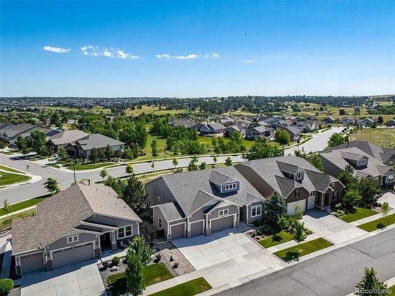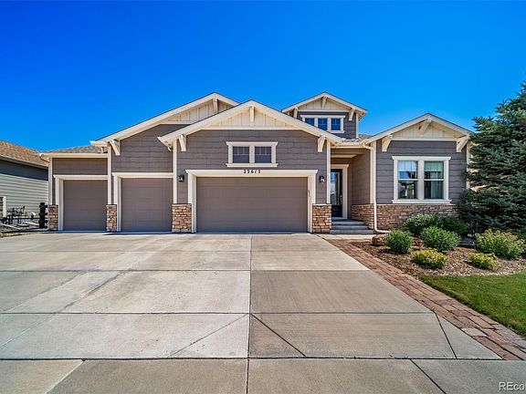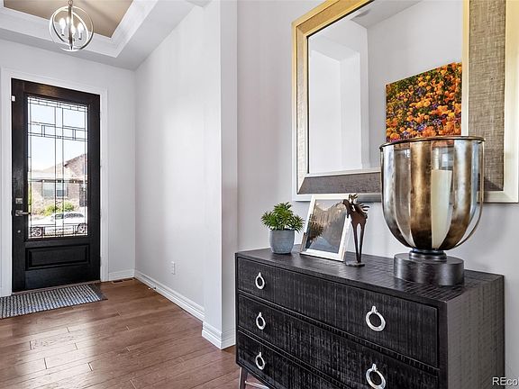 Stunning former model ranch home with high-end upgrades and custom finishes throughout! This 4 bed, 4 bath open-concept gem features 10’ beamed ceilings, luxury vinyl flooring, and 8’ doors on the main level. The gourmet kitchen is a chef’s dream—quartz island and counters, upgraded soft-close cabinetry, stainless steel appliances, glass tile backsplash, plus pantry. The spacious great room boasts a stone gas fireplace with built-ins and a wall of sliding glass doors opening to a covered deck with a cozy outdoor fireplace. The primary suite is a retreat with beam ceilings, a spa-like 5-piece bath with an oversized glass shower, and a custom walk-in closet. A flexible open office with built-ins or formal dining area adds versatility. The finished basement offers a large rec space, custom wet bar with full-size fridge and wine cooler, two large bedrooms, ¾ bath, and even a dog shower in the storage area! 4-car garage with epoxy floors, custom built-in storage and access to the private landscaped fenced backyard that backs to a neighborhood greenbelt. Located in a vibrant community with trails, open space, and the Inspiration Club that includes pool and tennis. This home has it all!