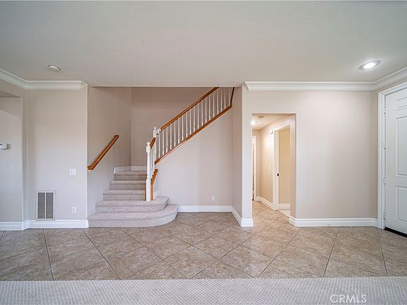 Upstairs, find a primary bedroom with a full bathroom with double sinks, a separate tub and shower, and a walk-in closet. There are also 3 additional bedrooms, a full hall bathroom with double sinks, and a linen closet. Enjoy the patio, grassy area, pool, and spa. The home boasts new paint, carpet, LED recessed lighting, high ceilings, crown molding, and a 3-car attached garage with direct access.