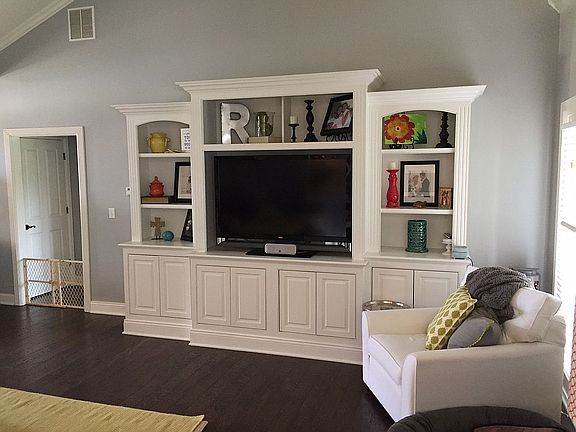 Beautiful home - open floor plan with wood floors, tile, and carpet in the bedrooms and bonus room. Bonus room has new separate central air unit. Kitchen has white cabinets and stainless appliances. Awesome entertainment center in the vaulted great room and covered back porch with TV. Built-ins are in the master walk-in closet.