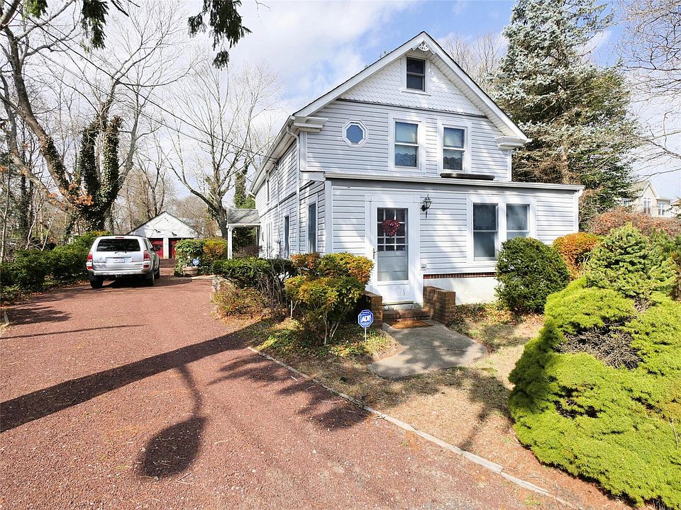 First Time on the Market! Steeped in local history, this charming 1,600 sq. ft. home—once an Inn—dates back to 1850 and has been lovingly cared for by the same family for nearly a century. Originally part of a six-acre estate, it now sits on a rare and expansive .84-acre flat lot, offering endless possibilities for outdoor enjoyment and entertaining. Perfect for car enthusiasts, contractors, or those in need of extra storage, the property features an oversized detached two-car garage plus a spacious shed—formerly a chicken coop—that can easily be restored or repurposed. Inside, the flexible floor plan offers convenience and character, including a main-level bedroom and full bath, the bedroom can easily be converted to a Dining Room to suit your needs. The enclosed porch is a charming retreat filled with natural light, can be perfectly used as a cozy sitting room, with ample space for storage, it effortlessly blends functionality with warmth and character. Upstairs, you'll find four additional bedrooms, one with a walk-in cedar closet and another that can serve as a library, office, or sitting area. A second full bath boasts modern updates, including a whirlpool tub and separate shower. The secondary staircase provides unique charm and easy access to the kitchen. Preserving its historic appeal, this home showcases original interior doors, hardware, custom moldings, and built-ins, as well as hardwood flooring throughout most of the home, including original wide-plank floors upstairs. Additional features include gas heating & cooking, plus updates like a newer roof, vinyl siding, and Andersen windows. Conveniently located with quick access to I-495, shopping, the local train station, and MacArthur Airport, this is a rare opportunity to own a piece of Long Island history. Possible Commercial property (buyers to make inquires with Town of Islip for zoning).