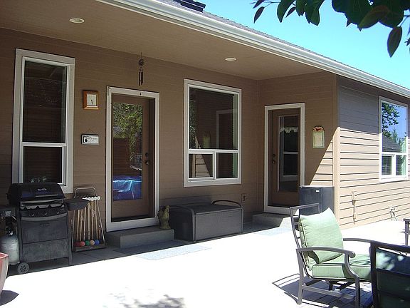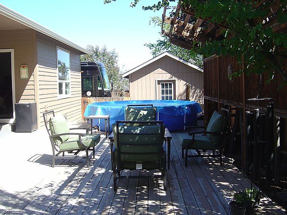 Back on market with no fault of the home. Beautiful home with vaulted center living & split bedroom layout. 3 bedrooms, 2 full baths plus den, new exterior paint, all in the Majestic Ridge Subdivision. Home is meticulously maintained by current owners. A huge center kitchen & vaulted living room. Kitchen has granite counters, knotty alder cabinets, center work island and rustic real oak flooring. New stainless gas range. All stainless Amana appliances. Arched doorways throughout. Master is huge w/a coffered ceiling & large tiled bathroom with 5. x 5. ft double head shower & walk in closet. Master and 3rd bedroom have access to back deck. Guest bath has tile floors & counters. Laundry has lots of cabinets, sink & tile floors. Efficient gas water water and gas heat plus central air. Approximately 800 sq. ft. of private deck/patio. A 19ft x 65 ft. RV pad with full hookups including 50 am service. A nice 12 ft X 14 ft. '' She shed or Man cave'', fully insulated and carpeted w/electricity.