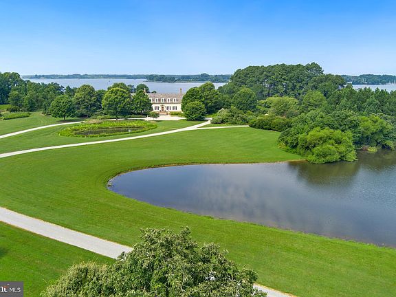 Hartwell Estate features 80 private acres with pristine, panoramic views on the mouth of the Langford and Chester River. This light filled custom built home and property captures the essence of serene living on Maryland's Eastern Shore. One of only 4 premiere properties at the end of Quaker Neck, often called "Kent County's Gold Coast" is sited to take advantage of the natural landscape with expansive views of the river, the owners' goal was to retain the feel and function of a working farm, but to add a modern house inspired by Maryland's historic heritage. The residence succeeds as a home for family comfort, entertaining, relaxing, gardening, hunting, fishing, birding and appreciating wildlife. Its east/west orientation highlights sunrises and sunsets that can be enjoyed from every room in the house. A real retreat. The five bedroom and 7 fireplace (woodburning) home was designed with 12-foot ceilings on the first floor to accentuate the views and the light. A main floor primary suite includes two separate ensuite dressing rooms and bathrooms along with a wood burning fireplace. The second floor has four bedrooms, three with fireplaces, and all with ensuite bathrooms. One bedroom has a separate sitting room. A wide hall runs along the width of the house providing access to all of the rooms. The property features the landscape design of acclaimed D.C. based Oehme, van Sweden. Hardscapes and plantings were strategically orchestrated and include a walled garden filled with flowering trees and shrubs along with a sweep of peonies in the spring. Three ponds invite active wildlife, including a beautiful blue heron. 50 acres of fields are currently being organically farmed by a neighboring farmer. An additional 3 bedroom and 2 bath cottage (c 2012), adjacent to a barn and silo, currently occupied by a caretaker, is situated near the property entrance. Two covered structures within the walled garden provide a relaxing reading or meditation venue. Bluestone and brick terraces along the entire river facing side of the house lead to a pool and pool pagoda. The property is uniquely designed to capture the feeling of the land while being welcoming and inviting to all who live there or visit. It has been lived in and loved by the original owner for over two decades. Family hunting and fishing are exceptional. Rock Fish is plentiful. The main residence has recently benefited from a new cedar shake roof and updated energy efficient French doors and windows throughout. The unfinished basement is approx. 2900 square feet with 9' ceilings, inviting the next steward to introduce additional lifestyle enhancements. Less than 10 miles to downtown Chestertown, with its restaurants, coffee shops, food stores, bookstore and vibrant music and art scene, this property combines riverfront tranquility with easy access to town. Additional FAQ: 2013-caretaker house built; 2020 small pond redesigned and landscaped; 2021 new cedar shake roof installed, copper gutters and downspouts repaired as needed; 2022 all windows and French doors on main level replaced with top of line Anderson product- trim removed, replaced and painted; 3 lintels in walled garden replaced with black walnut; 2024 resurfaced entire lane from Lands End Road to main residence; all windows and French doors on 2nd level replaced; farm buildings painted. Property access is restricted to scheduled appointments only.