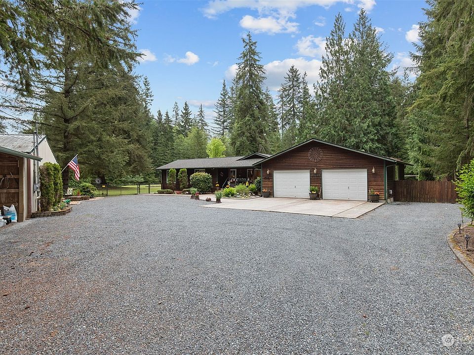 This secluded property offers the ultimate in privacy and security with gated entry and fully fenced yard. New carpet and fresh interior paint. There is a Tuff Shed with power and an insulated shop with a wood burning fireplace and winch/engine puller, perfect for year-round tinkering! The well pump system was replaced just two years ago for reliable, fresh water. There's plenty of parking space with a 2-car attached garage and a 2-car carport with power. The covered patio is an ideal spot for entertaining or relaxing. Inside, the home boasts a large living room that is open to the kitchen and dining room. The home is wired for generator. Enjoy the perfect balance of seclusion, convenience, and comfort in this lovely home.