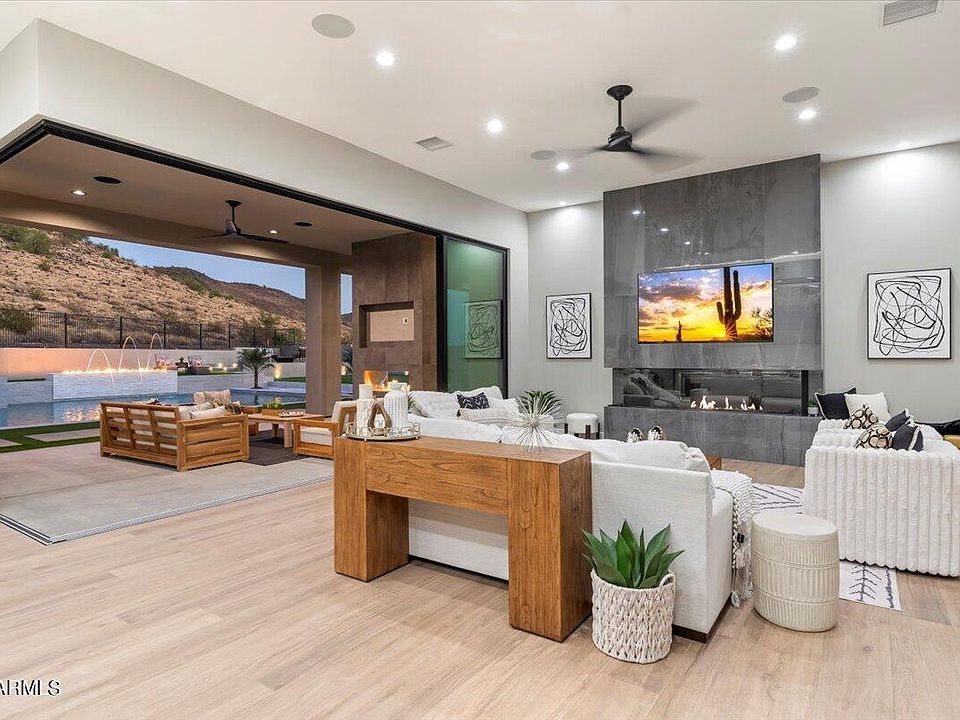 conditioned loft/flex space, 4 garage stalls in total, air-conditioned (with RV hookups)! If you seek space for boats/toys, RV, and/or car collectors - this is your home! The timeless finishes create harmony among the open cooking space, a full-height kitchen backsplash, modern cabinets a palatial island, hardwood floors, modern fireplace, Thermador stainless steel appliances, 10' glass retractable doors, 12' ceilings throughout, MASSIVE GAME ROOM with wine and bourbon storage, a separate office, mud room, two laundry set-ups, two oversized ensuites and primary bedroom which will leave you speechless. The spectacular demonstration of floor to floor-to-ceiling glass shower and soaking spa tub is the final touch of this residence. The resort like pool, outdoor living and entertainment space - a masterpiece, every single box checked of your most particular buyer. There is not a dollar spared, a feature missed. Gated, single level, abundant natural light, quality which you can not rebuild for.