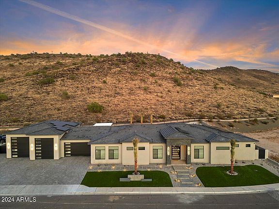 MODERN NEW CONSTRUCTION FINISHED 2023. Sleek single-level, panoramic views, anabundance of glass showcasing a mountain backdrop capturing the ultimate privacy. A car lovers dream includes two RV 14' door garages (one drive through) paired with an enclosed air