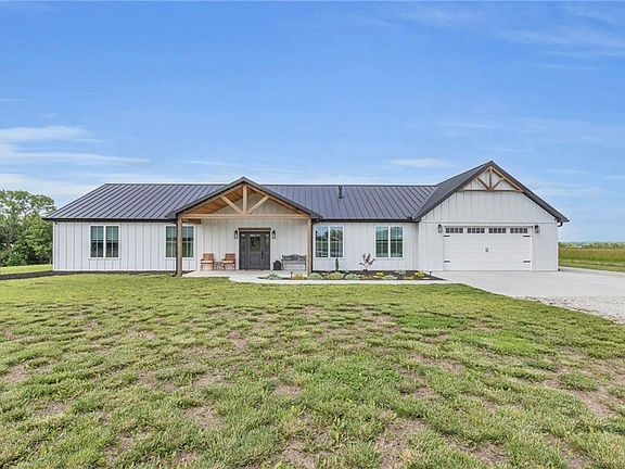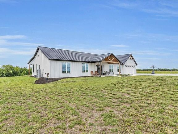 WOW!! If you haven't seen the home you've been waiting for and that makes you begin envisioning living and enjoying your new home, then your wait is over. The home owners have meticulously created the design, layout and decor with family and entertainment in mind. Let's begin outside, as you pull up to the house the visual does appear to be like that of a Barndominium, however it is a traditional (2x6) frame construction with FULL Standing Seem Steel Roofing and Steel Siding for a complete maintenance free exterior. To the right of the Grand Front entrance is the HUGE GARAGE. Measuring a massive 1090 square feet in total, it can easily park 4 vehicles PLUS a tractor with implements. The home resides on 10.8 acres with WOODS and a CREEK. It truly is a wonderful place for the kids and family as a firepit and table are at creek side. On the back of the home is a very large covered patio with 3 ceiling fans and enough room for a Graduation and Birthday parties. Enter the home and you immediately see POLISHED CONCRETE FLOORS which are bouncing sunlight up onto the Vaulted Ceilings with Beautiful wood beams. In Floor Radiant heating everywhere keeps the temperature nice and even throughout the year. Enter the Kitchen and fall in love with the MASSIVE kitchen island made with Custom Cabinetry. The GE Cafe Professional Series Appliance Package compliments both the stained and