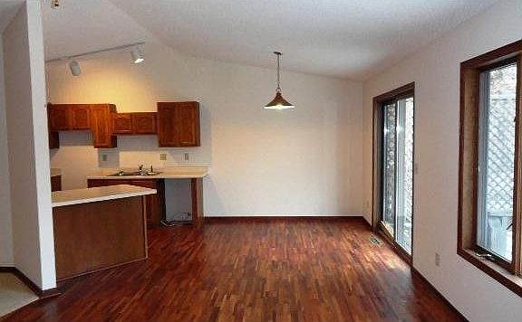 Split entry end unit townhome with new carpet and fresh paint throughout. Vaulted ceilings, hardwood floors, open floor plan, large master with walk-in closet, deck off of dining area overlooking private treed backyard.