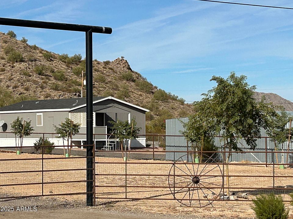 Welcome to the ever popular community CHANDLER HEIGHTS RANCHES unit three.... nestled near the end of Daniel Road... and located directly to the south (bordering) San Tan Mountain Regional Park. You will find this rare, hard to find horse property... This residence was recently established in 2022, it features a cozy and comfortable manufactured home with 3 comfortable sized bedrooms and 2 baths, open concept, and split floor plan. Front entry to greet guests looks out over the beautiful San Tan Mountains, back entry to laundry room/mud room... Outdoors the equine facility features a 4-horse Mare Motel, and sand-surfaced riding arena / turn out. The dust prevention U shaped drive, allows for clean easy entry/exit... Plenty of room to park your horse trailer behind the house. The enclosed carport can double for your car or a shop to house your tools. RV Parking included. No-Climb fencing surrounds the property... Concrete entertainment patio located on the North side of the home.