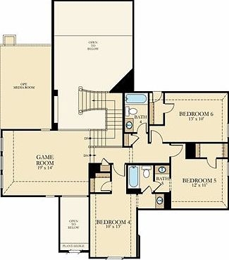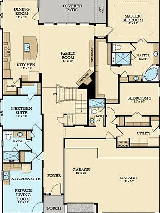 The spacious six-bedroom Picardy II Next Gen® plan by Village Builders features a unique dual living arrangement. A Home Within A Home®, the private suite offers a separate and private front entry, living room, bedroom, full bath, and kitchenette. The main home boasts an inviting front porch and foyer entry, island kitchen with walk-in pantry, dining room, spacious family room with corner fireplace, walk-in mud room and utility room, and a three-car garage. The master bedroom features an en suite bathroom with dual sinks, separate shower and corner tub, private toilet enclosure, and a grand walk-in closet. The first floor also offers a second full bedroom and bathroom. The second floor features three additional bedrooms, a game room, and the option to add a media room. The Picardy II also features the options to add an outdoor grilling area, and an extended covered rear patio.