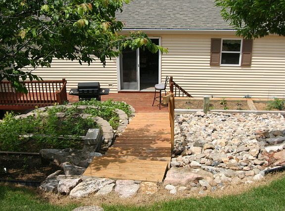End Of The Road Peacefullness Quiet setting with wonderful manicurrd yard with mature trees, plum, apple trees, and raised garden beds. Beautifully kept home with large kitchen and open floor plan. White oak cabinets with pull outs, Corian counter tops,and nice pantry. Vaulted ceilings throughout. Huge master bedroom with bath. Pellet stove heats the entire house. Club house outbuilding, storage shed, and 2 car detached garage.