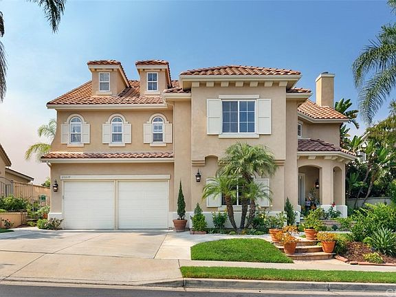 Welcome home to this stately 3 story, 5 bed/4.5 bath residence. Situated high above other StoneRidge residences this home has sunset & panoramic view from the backyard & Saddleback Mountain view from the front. The porcelain tiled entry with chandeliers showcases the elegant dual staircases. To the left you have the downstairs bedroom/office/den with a full 3 piece bathroom. To the right you have the formal living room with fireplace that is open to the formal dining room with a grand chandelier. The kitchen has granite counters with breakfast bar, a Viking 6 burner stove, with a spacious alcove for informal dining. Kitchen area is open to the family room with cathedral ceiling & fireplace. Lots of windows making it light and bright. Once you traverse the elegant stairway there is a hallway leads to a large master bedroom, 2 large walk-in closets. Master bath has dual vanities, large tub &walk-in shower. On the other wing of the 2nd story - 3 more bedrooms (1 with en-suite bathroom), laundry room & another bathroom. The 3rd story is a perfect get away for kids, theater room, billiards room, or office. Flagstone accented large patio with large grassy area is perfect for outdoor dining. Home has a 3-car garage (1 tandem). Stoneridge is a prestigious guard-gated community with membership to Lake Mission Viejo. Whether you are looking for the perfect home for your family or an entertainer's dream home, or both, this home is move in ready.