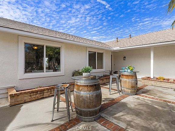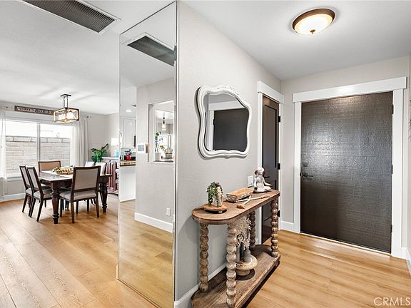 This stunning El Dorado single-story home has been beautifully remodeled and showcases breathtaking 180-degree panoramic views of mountains, city lights, and spectacular sunsets! Nestled in the sought-after Saddleback school district this 3-bedroom, 2-bath residence boasts vaulted ceilings, 2022 new central A/C and furnace, as well as new ducting & attic insulation in 2021, and impeccable upgrades throughout. High-end finishes include luxury waterproof wood-plank vinyl flooring, dual-pane windows, custom window treatments, craftsman-style window and door casements, high baseboards, recessed lighting, ceiling fans, and solid wood raised-panel interior doors with Emtek hardware. Designed for modern open-concept living, walls have been opened to create a seamless great-room style layout, where the spacious living room features a striking stacked-stone fireplace with mantel, flowing effortlessly into the dining area with a built-in wine bar, wine fridge, and granite counter. The reimagined chef’s kitchen boasts granite countertops, a chic mosaic tile backsplash, a large center island, an added breakfast bar with pendant lighting, white cabinetry, stainless farmhouse sink with stunning view-facing windows, and premium stainless steel appliances. Curb appeal abounds with a manicured front lawn, lush landscaping, new exterior paint, 2021 new roof, and a private courtyard leading to a large front door that opens into a wide foyer and light-filled interior. Expansive sliding glass doors seamlessly connect indoor and outdoor living, inviting you to enjoy the tranquil California lifestyle in a beautifully designed backyard featuring two large covered patios—ideal for entertaining, dining, or simply unwinding—all while taking in the breathtaking views. The luxurious primary suite features direct patio access with a sliding glass door which provides an unobstructed view of the city lights at night, frosted pocket door leading into the walk-in closet, and a remodeled en-suite bath with granite countertops, Travertine flooring, a shiplap wood ceiling, updated fixtures, and an oversized Travertine walk-in shower with a built-in bench. Two additional bedrooms provide versatile space, including one with a built-in Murphy bed, ideal for an office or guest accommodations. This exceptional home also includes membership to beautiful Lake Mission Viejo, offering access to beaches with crystal clear water and an array of recreational activities.