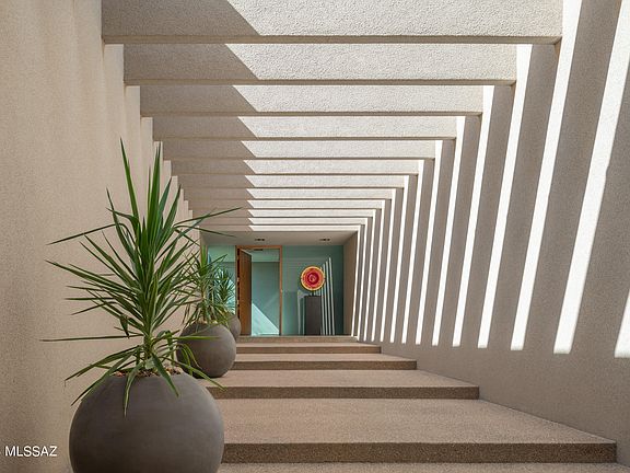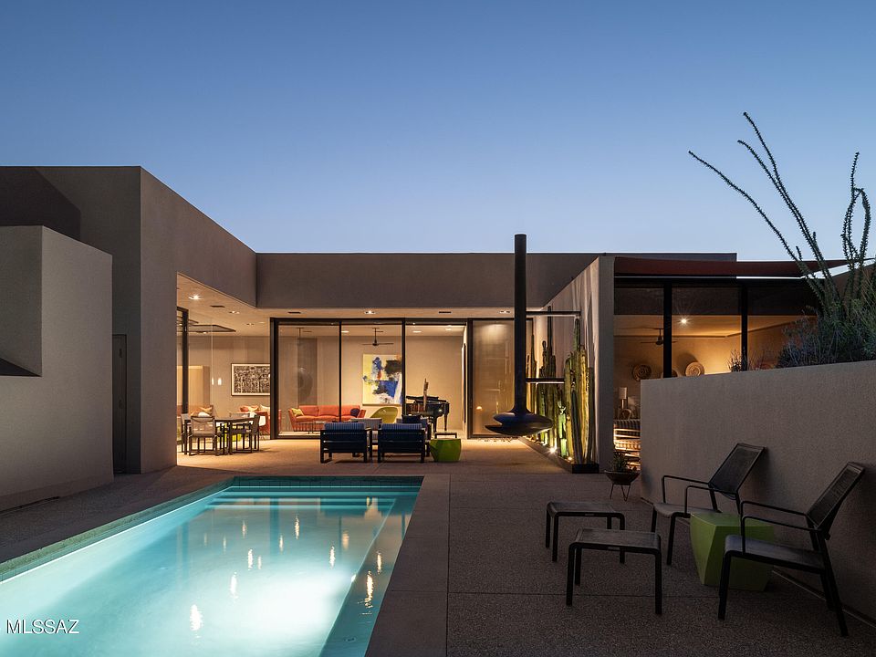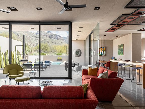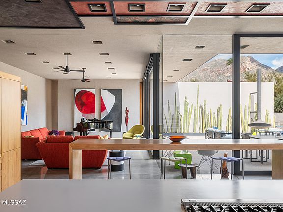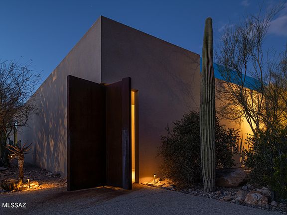 Located in the highly sought after Pima Canyon Estates community and designed by award winning and internationally acclaimed architect Rick Joy, this modern desert home is privately situated on a 1.12 acre homesite, with unobstructed views of the surrounding Catalina mountain range. Through careful integration, the home dissolves boundaries between built form and natural expanse, blurring distinctions where the desert landscape becomes not merely a backdrop, but an integral part of the spatial experience, a testament to the symbiotic relationship between architecture and environment. Through strategic placement of Ameristone walls, and expansive floor to ceiling windows, the interior space establishes a profound dialogue with the surrounding panorama, allowing the shifting play of light and shadow to choreograph the narrative within, while turning rooms into a continuous visual experience. Beautifully milled walnut cabinetry is meticulously crafted to offer both warmth and precision to the space, serving not only as a concealed storage solution, but as a spatial delineator, anchoring the kitchen within the open concept living area, while maintaining an air of fluidity. Linear functional counter space, thoughtfully integrated into the design, offers both practical utility and visual cohesion, providing ample room for both the culinary experience and social engagement alike.