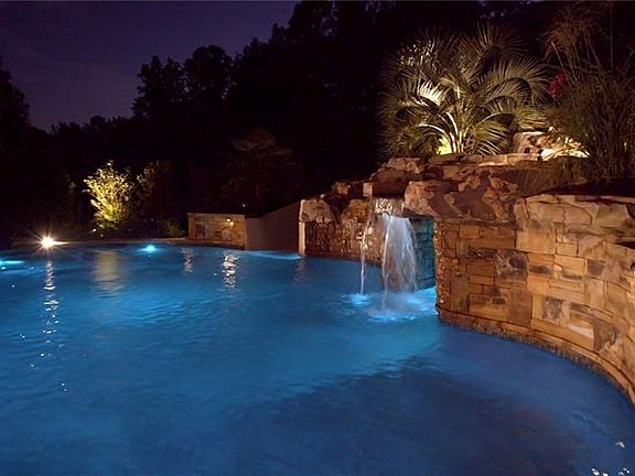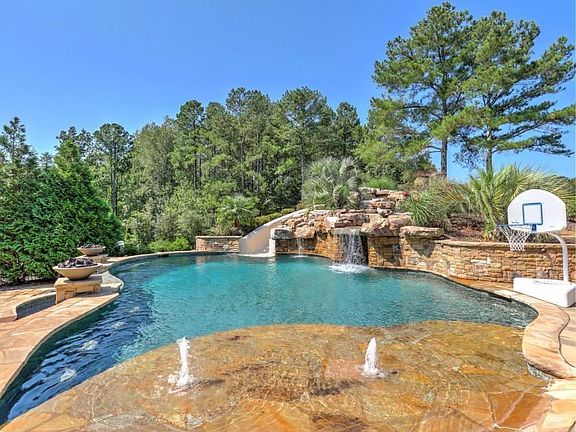 Breathtaking lakeside retreat, sited on sprawling, landscaped grounds, showcases an opulent saltwater pool w/waterslide, waterfall, sunshelf w/fountains, accented w/LED lighting/tropical foliage/fire bowls. Behind pool is flagstone patio w/firepit. Staydry flagstone patio off terrace level boasts outdoor kitchen/bar. Large covered deck off main. Finished Terrace level offers wetbar w/kegerator, BR, full BA, movie room & more! Main & upper levels boast extensive millwork, 3 FPs, Chef's kitchen, vaulted keeping room, large BRs w/ensuite BAs, fireside master w/ to-die-for' closet and more!