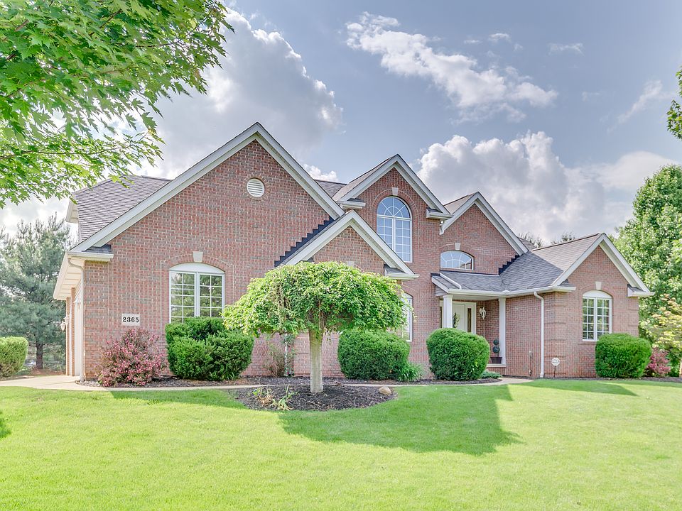 This brick colonial is in Saint James Place on a private corner lot. First floor master suite with large walk in closet, attached bath with double sinks and standing shower unit. Office off of the front entrance with access to this bathroom as well. Beautiful columns, and tray ceiling in the open dining room. Cathedral ceiling, skylights, and extra large living room with a corner fireplace. Cherry stained hickory woodwork throughout brings this classic charmer to life. The kitchen boosts a double oven and counter top range. Raised breakfast bar area and eat in kitchen, The patio slider doors lead out to the enclosed porch with composite decking and windows that were installed in 2009. Brick patio. The finished lower level offers a section for a work out room and a fifth bedroom, in addition to the living spaces Three bedrooms upstairs with plenty of closet space. Beautiful sunburst windows. First floor laundry and washer and dryer are included. Plenty of space in this three car garage with heat, water, and drain. Storage units stay. Home Warranty included. Move right in this well maintained beauty.
