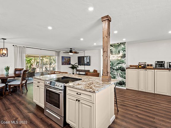This completely remodeled 1228 sq.ft. home offers 2 bedrooms, 1.5 baths, a den, and a screened-in patio surrounded by mature landscaping. Fresh new interior and exterior paint. The open layout seamlessly connects the living, dining, and kitchen areas, creating an ideal space for entertaining. The kitchen features brand new appliances, granite countertops, a wine rack, and open shelving. Utilize the additional room as a guest room or home office, and take advantage of the den's versatility to suit your lifestyle. Outside, enjoy the screened-in patio and the gentle coastal breeze. The property includes a carport, NEW stainless steel appliances, NEW A/C, NEW plumbing. This is also a fully functioning AirBNB so investors come take a look! ALL FURNISHINGS INCLUDED!