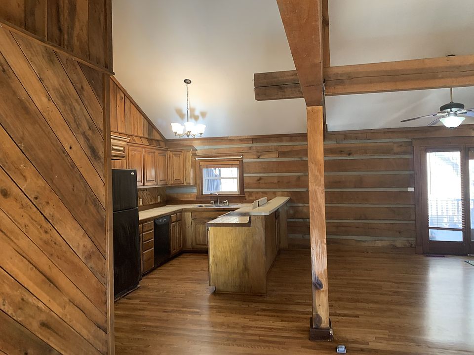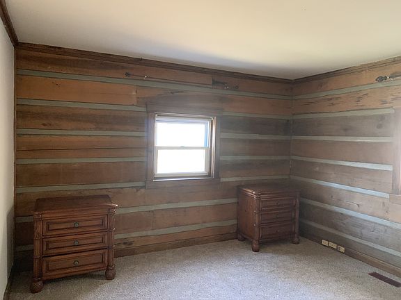 LOG CABIN NESTLED ON 4 ACRES. HARDWOOD FLOORS HAVE BEEN REFINISHED. PRIVATE DECK OFF BACK OF HOUSE.BIG FRONT PORCH.FRANKLIN FIREPLACE. STORAGE BUILDING. All appliances remain . Storage shed remains.