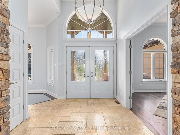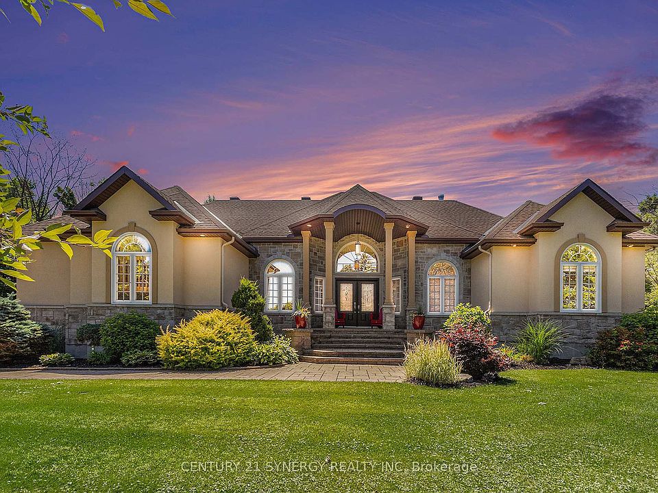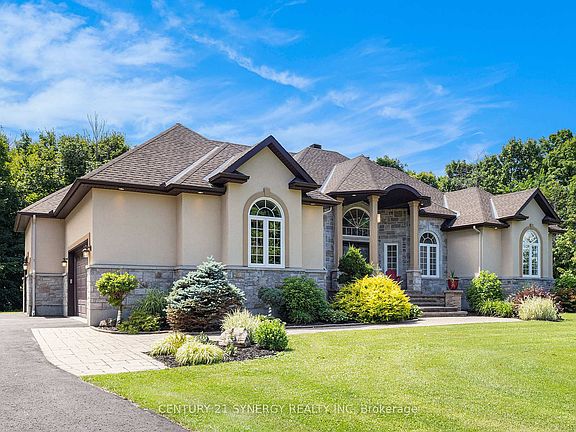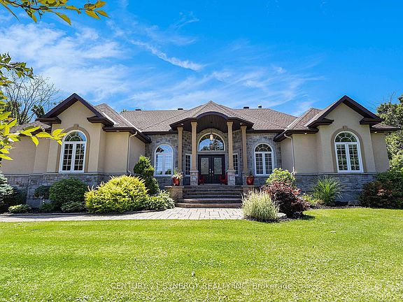 Nestled on a private, beautifully landscaped 1-ACRE horseshoe treed lot, this stunning stone and stucco bungalow offers exceptional curb appeal and luxurious living. The home features an abundance of natural light, heated marble flooring throughout the main level, and a striking stone arch foyer that opens to a spacious layout with 5 bedrooms and 4 full bathrooms. A full IN-LAW SUITE with private entrance, large windows, gas fireplace, and in-unit laundry adds versatility for multi-generational living or profit from collecting rent to subsidize your living costs. The elegant interior boasts coffered ceilings, a grand stone wood burning fireplace, and a gourmet kitchen complete with stainless steel appliances, gas cooktop, granite counter-top and a walk-in pantry. The expansive primary bedroom includes a spa-inspired ensuite with a double sink vanity, soaker tub, and glass walk-in shower, along with the convenience of a main floor laundry room. Outside, the property transforms into a private oasis with an interlocked patio, in-ground saltwater pool, firepit, and a versatile screened-in porch offering panoramic views equipped with ceiling fan and infrared heater for comfort. A TRIPLE GARAGE provides ample storage for vehicles and more. A recent 15 ft x 25 ft outdoor shed was added with running hydro. This one-of-a-kind home seamlessly blends elegance, comfort, and resort-style living.