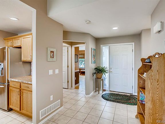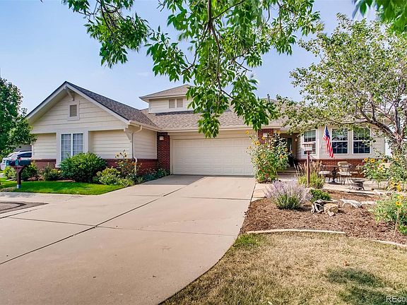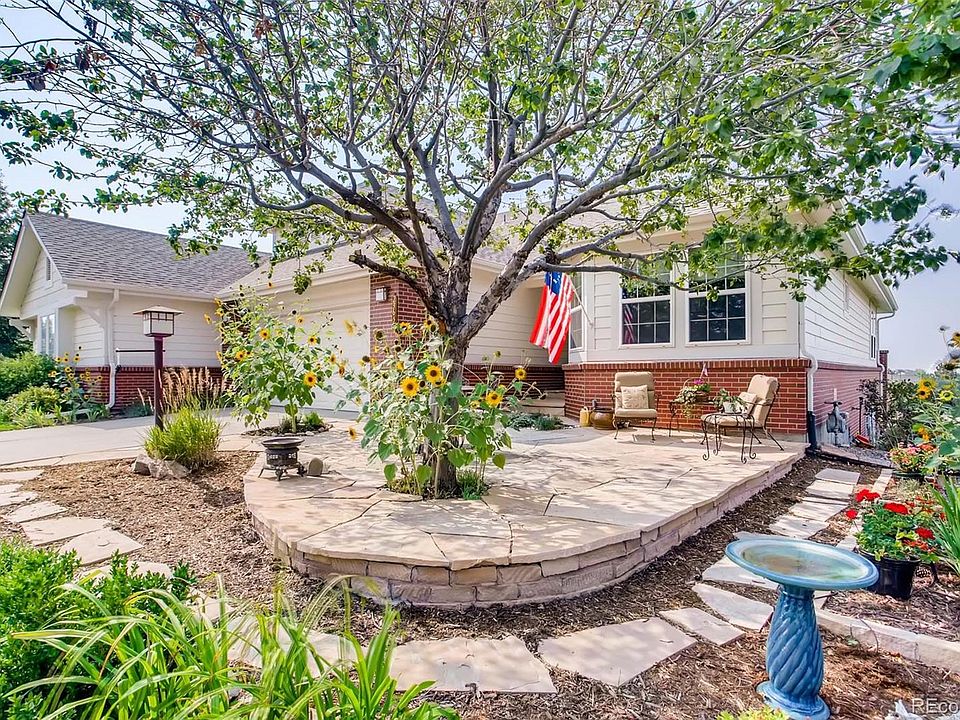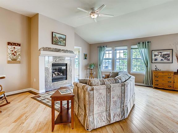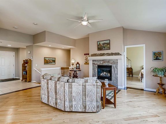 Beautiful ranch townhome resting on a cul-de-sac in the sought-after Heritage Eagle Bend community! Just steps from the Piney Creek Trail, this spacious three-bedroom features an ideal location, exquisite curb appeal, and high-quality upgrades throughout. Rest easy with a new storm door, newer impact-resistant roof, and all new windows in the walkout basement. Past the welcoming foyer, find the sunlit living room boasting gleaming hardwood floors, a fireplace, and ceiling fan. Just beyond, the open dining area provides access to the upper deck. The expansive kitchen is appointed with slab granite countertops, stainless steel appliances, a walk-in pantry, and an island with sleek pendant lighting. Graced with a vaulted ceiling, the vast master suite presents an upgraded en suite bathroom with a luxurious granite-topped dual vanity, as well as a large walk-in closet. Engulfed in natural light, the secondary bedroom can also be used as an office, flex space, or craft room! A full bathroom and laundry room round out the main level. The full-sized, walkout basement presents a recreation room with built-ins, a fully conforming bedroom, a well-sized office, and a remodeled three-quarter bathroom featuring a brand-new tile floor! The immaculate backyard boasts an upper deck with incredible views, a covered patio, and massive, vibrant lawn. The gorgeous front exterior showcases a flagstone patio, seasonal sunflowers, garden area, shade trees, and south-facing driveway. Heritage Eagle Bend is an active and social 45+ community with beautifully maintained homes. Enjoy walking trails, swimming pools, recreational activities, a restaurant and bar, and a newly renovated 35,000 square foot clubhouse with a new fitness center, library, meeting rooms, ballroom, tennis, bocce ball and pickle ball courts. Easy access to DIA, E-470, downtown Parker, Southlands Mall and the Denver Tech Center.
