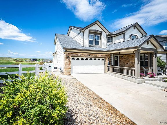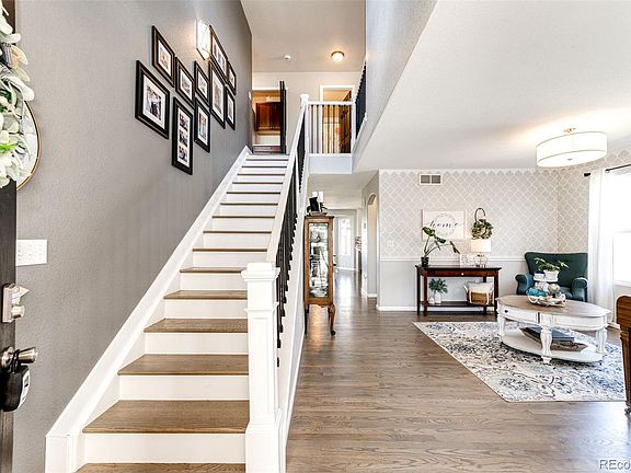 This five-bedroom four-bathroom home impresses with its incredible location in the Murphy Creek neighborhood. The main floor features neutral colors, an eat-in kitchen, a dining room, a main floor office with built-in bookshelves, a bathroom, and a family room. The family room has a gas fireplace and updated fireplace surround, which is the centerpiece of this home. Not to mention the impressive hardwood floors throughout the main living area. The beautiful kitchen has quartz counters, tile backsplash, and stainless appliances. The newly remodeled staircase features wrought iron spindles and large decorative posts. The primary bedroom and stunning remodeled bath are upstairs, looking out to the spectacular mountain sunset and golf course views. The second-floor living space has three more bedrooms, a full bath, a loft, and a laundry room! A fully finished basement of just under 900 square feet has a bedroom, a full bath, a kitchenette, a family room, a fitness room with mirrors, and multiple storage areas. The home backs the 13th hole on the golf course and has a large partially covered deck spanning the width of the house, perfect for entertaining, selling lemonade, or relaxing! Enjoy countless community amenities, including parks, trails, a clubhouse, a restaurant, and a pool, all in a golf course community! Murphy Creek P-8 school is also located within the community for added convenience! Easy access to DIA, Denver Tech Center, and downtown with more retail and commercial planned for the area!