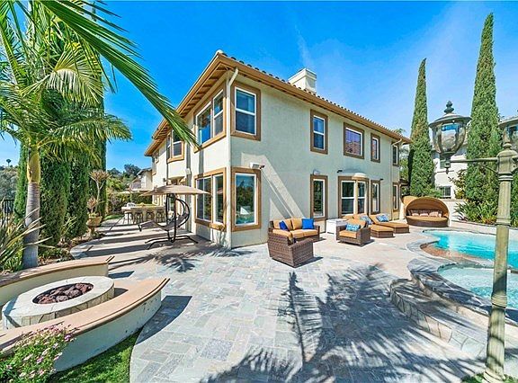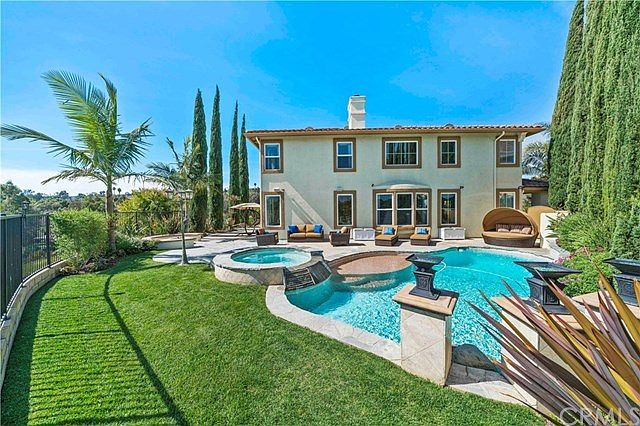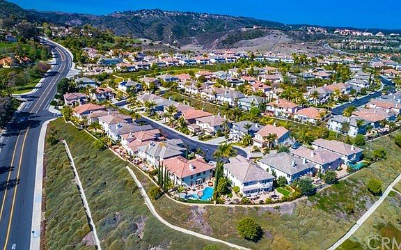 Nestled on THE BEST LOT IN PRESTIGIOUS GUARD GATED HILLCREST ESTATES with a private & awe-inspiring resort-style backyard boasting desirable privacy & panoramic views, this sprawling beauty will take your breath away! Stunning curb appeal & desirable layout make a striking impression as your guests will be captivated by the expansive rear yard & splendor of outdoor living space. Located at the end of a cul-de-sac offering serene privacy & a luxurious heated pool and spa, and an exquisite firepit framed by spectacular landscaping is reminiscent of a 5-star resort...no expense has been spared. The romance & grandeur extend to the home's interior with distinctive details at every turn. Highlights include chef-inspired kitchen & open family room, elegant formal living & dining with dramatic 20 feet ceilings with custom chandeliers, remote controlled fabric shades, surround sound, alkaline water filtration system throughout, Pez piping & lower level bedroom currently used as an office. Luxurious master suite is an intimate place to relax with the master retreat separated by French doors to enjoy reading or watching TV. Spacious secondary bedrooms enrich this home's value offering comfortable living spaces for the entire family. Close to beautiful beaches, restaurants, John Wayne Airport and shopping this luxurious home is a rare opportunity at this price. **Hurry!** Only ONE like this!