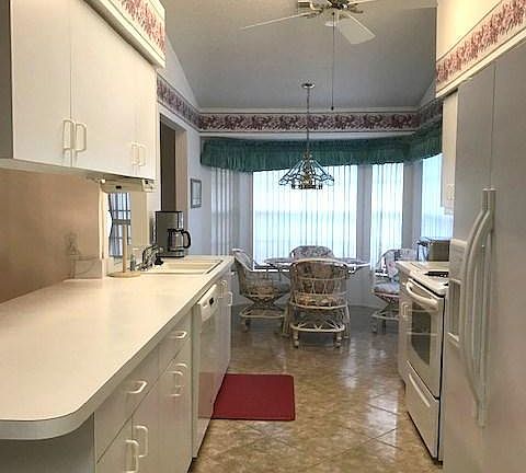 This expanded Oakmont villa is an end unit with lanai to enjoy private backyard. Cathedral ceilings, open floor plan, brand new carpeting and lots of light make this so inviting when you first walk in. The kitchen with nook is open to great room. The inside laundry includes washer and dryer. The master suite includes a dual vanity and walk-in shower. Brand new roof to be installed shortly. Immediate occupancy. Call today.