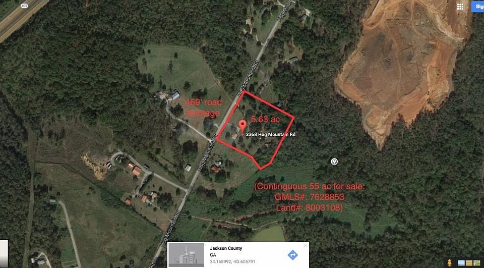 5.63 acres contiguous to the 56.19 acres @ 2144 Hog Mountain Road with 850' of road frontage. This plot adds 469' of additional frontage on Hog Mountain Road. Easy access to I-85 and GA 129. Located between the new Jefferson Mills Development and the Kubota expansion. No wetlands or floodplain. Open space, slightly rolling. Survey included in documents. Please refer to tax map parcels 079 008 and 079 008C.
