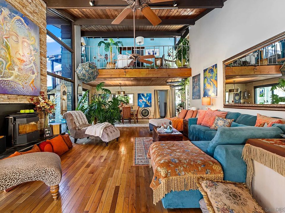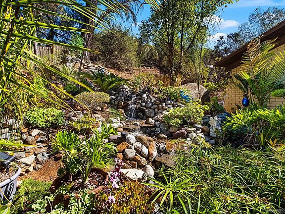 It’s as unique as you are—your own private, tropical retreat nestled in the foothills with stunning views of hawks circling the treetops. It’s calm, quiet, and tucked away from it all in Palo Verde Ranch—yet you're just minutes from stores and restaurants. This jaw-dropping custom home is a rare, one-of-a-kind find. An artful 25 foot high waterfall cascades down as you approach the front door and flows under a bridge—each time you walk across it, you slow down and breathe a little deeper. The spectacular soaring glass foyer welcomes you in. Floor to ceiling windows flood the sprawling living/dining area with natural light, and the warm honey-toned high vaulted ceilings give a golden glow. A dramatic 20 foot high stacked stone fireplace anchors the space. The updated open-concept kitchen and den—with its stacked stone wall, fireplace, and granite hearth exude comfort and ease. Real hardwood floors, custom details, and thoughtful design give this home its uncommon blend of elegance, warmth, and character. All three bedrooms boast the rich, honey-colored vaulted wood ceilings. The serene primary has a spacious walk in closet and a high deck with views. There are two and a half bathrooms, plus a bonus space—ideal for a home office, guest area, or creative studio. All rooms except one connect to the outdoors through large sliders, and each of four decks offers a different view of the trees, boulders, and mountains. A breezy 27x27 covered deck adds even more outdoor living space for dining, entertaining, and spectacular sunsets. You also get owned solar, zoned AC plus a bedroom unit, a two-car garage with half bath and laundry, two carports, a 16x12 detached workshop, and ample parking space. The sparkling salt water pool with its giant Trex deck, gazebo, and carefree turf is perfect for relaxing. With 107 queen palms waving gracefully in the near-constant gentle breeze, 40 giant bird of paradise, and multi-colored flowers, visitors ask if this is a resort. The landscaping conserves water, doesn’t require mowing, blends with nature, and is lit with solar lights. Massage your worries and aches away in the chlorine-free 30-jet hot tub, visited by hummingbirds, owls, and doves. Equestrians and hikers appreciate the miles of trails right out the door. The barn can be used for horses or storage. Walk one block to a gorgeous lake, tennis/pickleball courts, a horse arena, and picnic pavilion set amongst picturesque ancient oaks, giant boulders, and trails with views of the Cuyamaca Mountains beyond. As part of the Palo Verde Ranch community, you also enjoy a clubhouse, gym, another park with a larger lake, sand beach, and lush lawn, a boat dock (electric boats only,) fishing, huge picnic pavilion, fun events, and more. This kind of property rarely comes along—peaceful, private, and unique character, all in a well-established, friendly community with top-notch amenities yet unbelievably low dues. If you’ve been looking for a home that feels like being on year-round holiday, this might be the one.