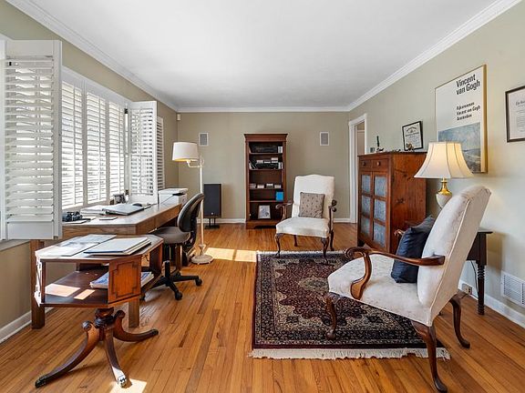 Charming gold chandelierMagnificent wall of windowsSitting roomSleek slate parking padWhite custom cabinetsWell-appointed kitchenPrivacy shutters