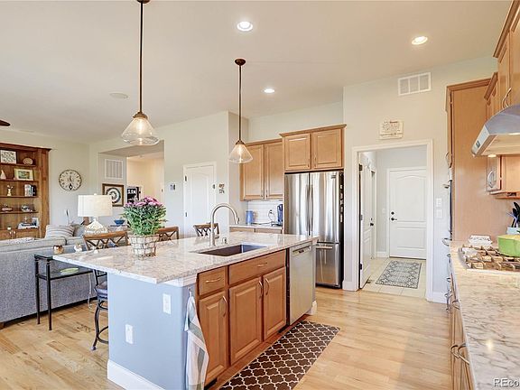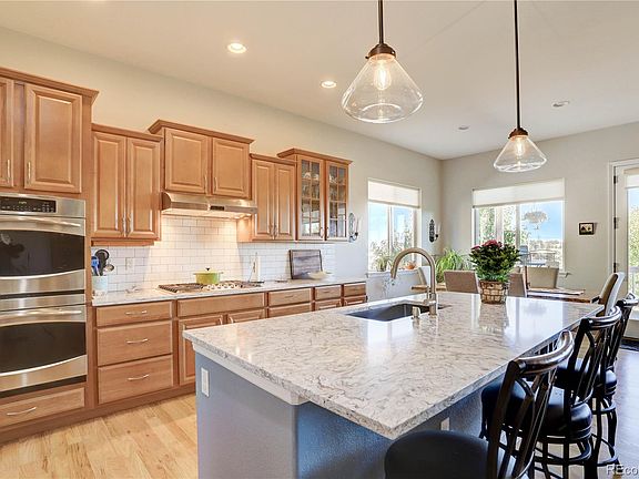 This beautiful home has been meticulously maintained and shows like new! Pride of ownership abounds throughout this turn key property that is in the desirable and sought after Inspiration Neighborhood. Enter in through a grand foyer and be greeted by beautiful custom, built in cabinets and custom tile around the focal point fireplace, high ceilings, gorgeous wood floors, a magnificent chefs kitchen including spacious, upgraded quartz counter tops, with a granite sink (matching quartz in laundry and master bath rooms) new back splash, higher end stainless appliances including a newer cook top and double ovens, tons of cabinet space with large pantry(s) and a stainless vented exhaust fan. Retreat to your main level primary bedroom that offers views of open space (no neighbors), a gorgeous 5 piece bath and a grand walk in closet. Other main level highlights include a bright/functional den/office, and second large convenient bedroom. Downstairs you will find a bright finished, walk out lower level featuring a second primary bedroom suite with a beautiful custom bath, a wine cellar, a large craft/multipurpose/bedroom, and a wet bar. Ease outside to a low maintenance artificial turf backyard, raised irrigated gardens, gorgeous landscaping that offers serenity and privacy, a covered porch with cooling ceiling fans accenting the expansive eastern views. Fine details are everywhere including a custom closet system, Hunter Douglas blinds, a beautiful entry door with frosted glass panels, newer interior and exterior paint, a newer roof and H20 heater, epoxy floors in the garage and main entry foyer, composite decking, tons of storage throughout including overhead garage storage. All this in a neighborhood with a dog park, pool, mtn bike trials, playground, Hopps garden, connecting bike paths, skate park, tennis courts, amphitheater, and all conveniently located to E-470, DIA, shopping, schools, entertainment, recreation, and commerce. This is MUST SEE Real Estate!
