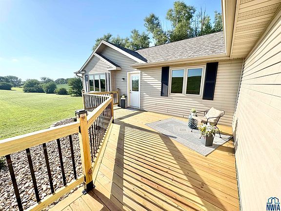 Beautiful completely renovated 5 bedroom, 3 bathroom, ranch style home on just over 3 acres on paved C60 road. Have you be dreaming of building a new home on an acreage in Plymouth County? Look no further than this fully updated home just outside Hinton. Approaching this property with a 3 stall attached garage a large outdoor living space perfect for sitting with a cup of coffee in the morning or lemonade in the afternoon is the first impression of HOME. Entering the home the open floor plan has all finishes on trend. The kitchen has a pantry, a window above the sink to watch wildlife, a breakfast bar and vaulted ceiling. Dining area has a slider leading to fantastic a grilling deck ample for outdoor dining and bird watching, steps that wrap around the side of the home to lower level walkout. The main floor master bedroom has walk in closet, new flooring, lighting, and attached spa like master bath, relax and rest in the whirlpool tub, shower and vanity. The bedrooms on this level have new closets, new lighting and carpet. A full bathroom on the main floor has LVP flooring, tub surround, plumbing fixtures and lighting. Main floor laundry and coat closet off the garage. The lower level walkout has new drywall, lights, and luxury vinyl plank flooring. Two additional bedrooms on the lower level and an entirely NEW bathroom complete quartz countertop vanity. The mechanicals are all NEW here. NEW Marathon water heater, NEW pressure tank, reverse osmosis water softener, furnace and air conditioner. All windows, doors, trim, flooring and inside of closets have been replaced. Home has been replumbed with Pex piping. NEW roof. Too many updates to list. No need to start from scratch when everything here is renovated and replaced. The home sits on the far edge of the property. Unlimited opportunity for a hobby farm or outbuildings. This could be the one. Save time and money. See home before committing to the large investment of building. Lower taxes and privacy included!