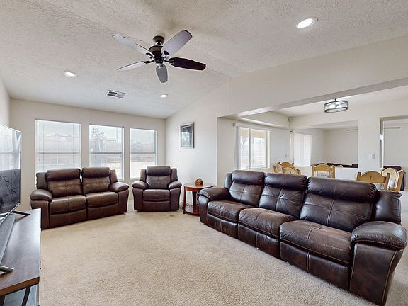 PRICE REDUCED! Lovely single story home in Rivers Edge on 1/3 acre lot! Primary bedroom with walk-in closet and full bath, 2nd and 3rd bedrooms are also spacious and share a full bath. Two nice living areas and two dining areas as well. Newer stove and microwave in the open eat-in kitchen, with a pantry. Attached 2 car garage is over sized. Vivant Smart Home system in place. Solar panels ! Newer water heater recently installed. Close to bosque trails and the river! Smart thermostat for the heater. Service room for laundry area also has a water softener. Newer PEX piping throughout. Home is sold in as is condition.