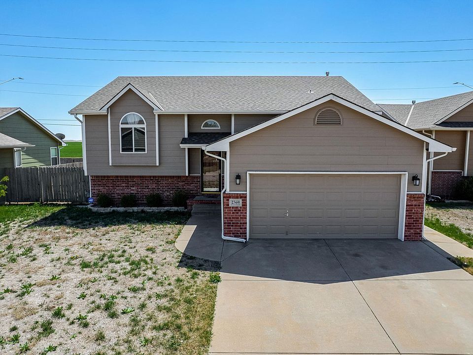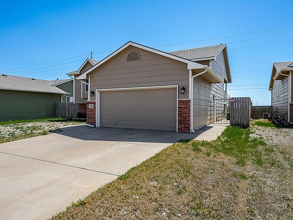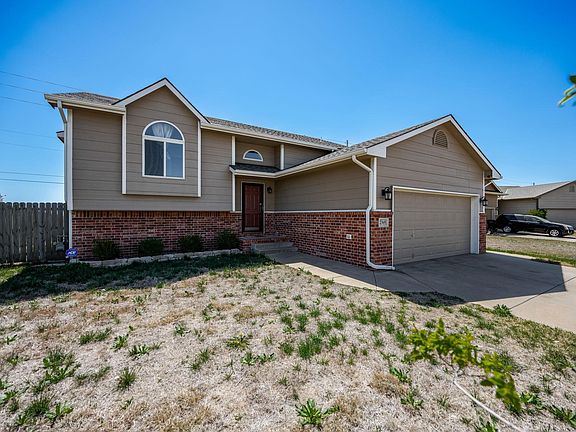 Check out this move in ready 4-bedroom home in the Goddard School District! Walk into the tiled foyer leading you up to the main level featuring wood floors throughout, vaulted ceilings, an attractive gas fireplace, and more. The spacious living room opens up to the kitchen which comes equipped with stainless steel appliances, granite countertops, and ample storage space. You’ll appreciate the dedicated dining area with stylish tile flooring with a great view of the covered back deck. The main level comes with a full hall bathroom and 2 bedrooms, including the primary with its own private full bath. Head downstairs to find the huge family room with a wet bar, 2 large bedrooms, and a full bathroom. Outside you’ll appreciate the covered deck leading down to the large concrete patio. Enjoy the privacy and peaceful view of an open field out back with no homes behind you! Don’t miss out on this amazing opportunity! Call for a tour today!
